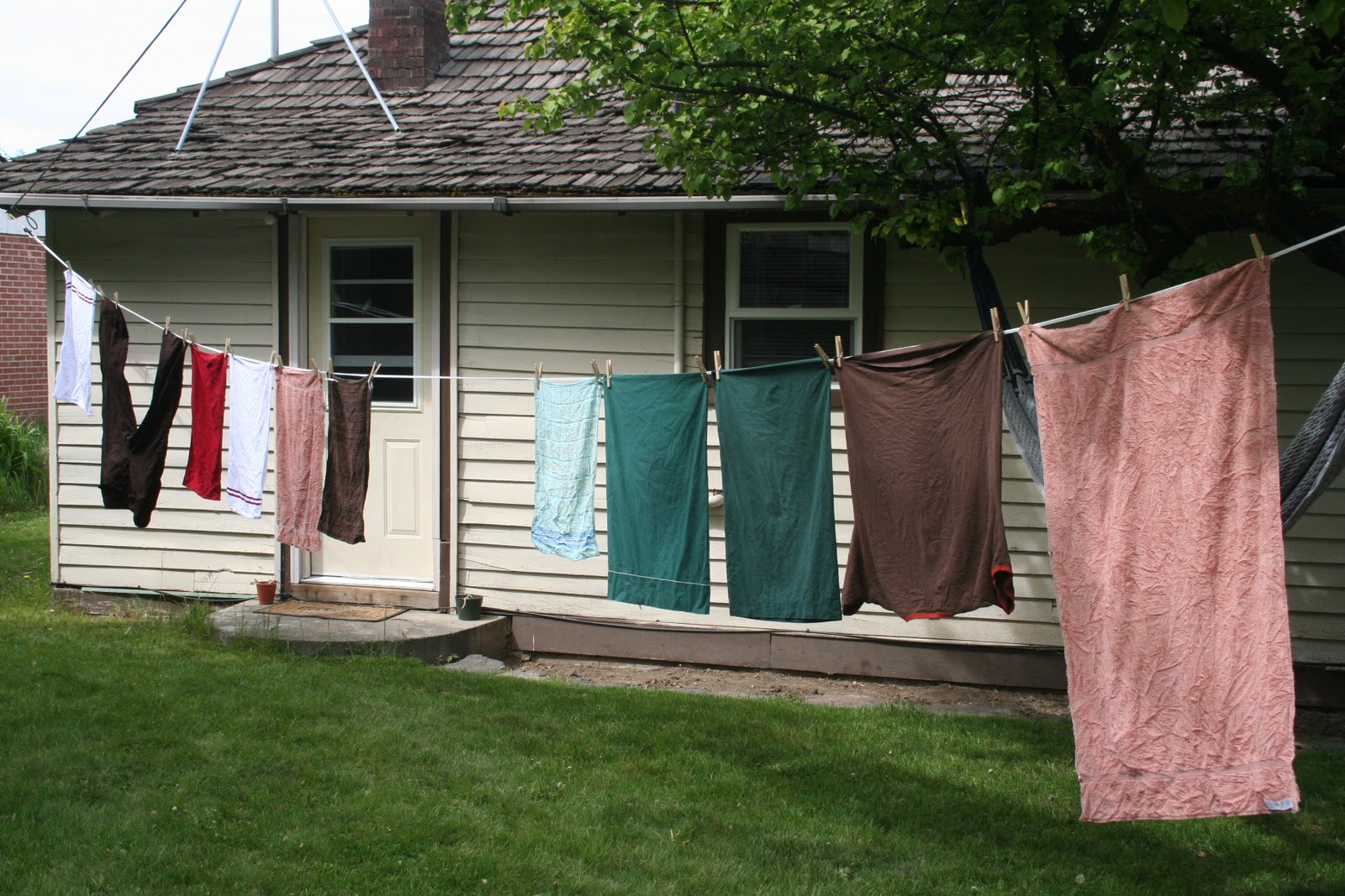 Last spring, I convinced Chris to put up a clothesline in our backyard (seen above). Our dryer worked, but I love the smell of line-dried clothes. It's also a lot more fun and saves money. Obviously, that doesn't work in the snow or rain, but during nice weather, it's something I enjoyed doing. And between the wind and using fabric softener, they weren't too stiff/crunchy.